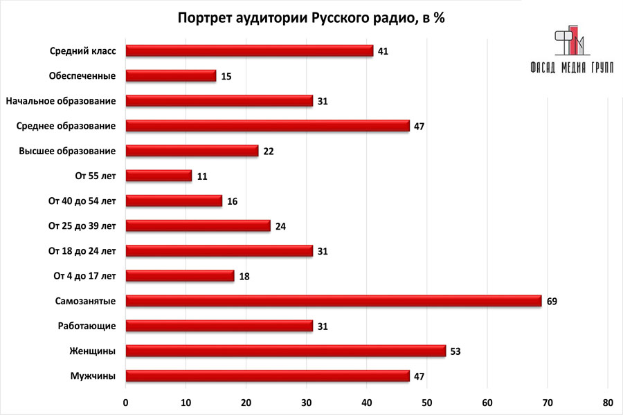 Благодаря качественному, сбалансированному контенту аудитория «Русского радио» многочисленна и разнообразна.