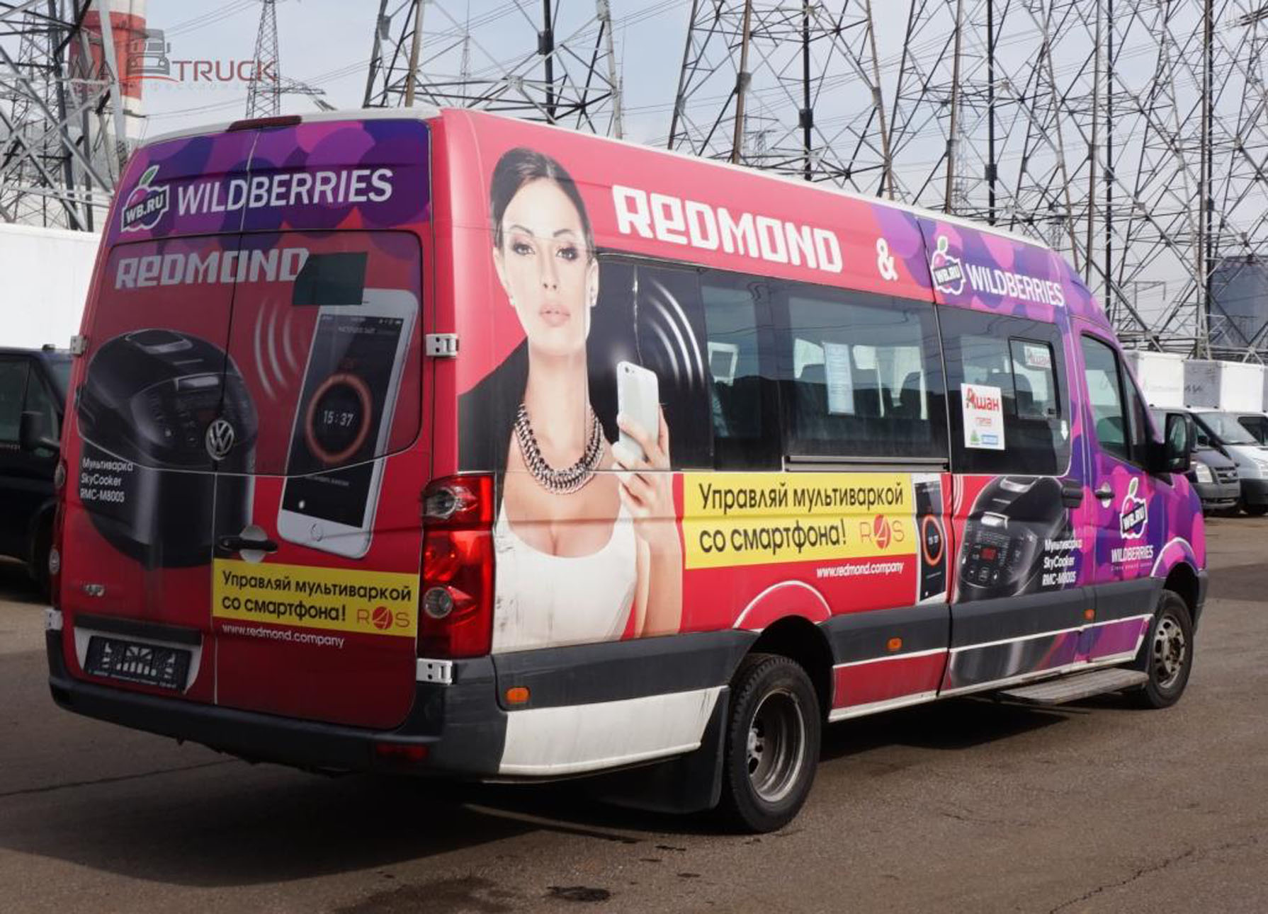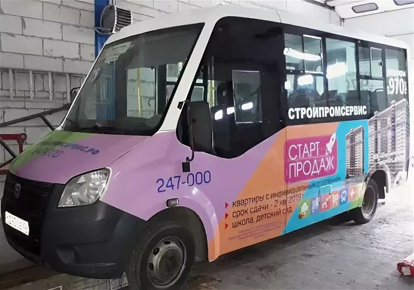 3) процесс брендирования (оклейки) маршрутки рекламой: