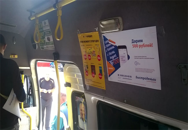 Рекламные стикеры в маршрутке на фото выше