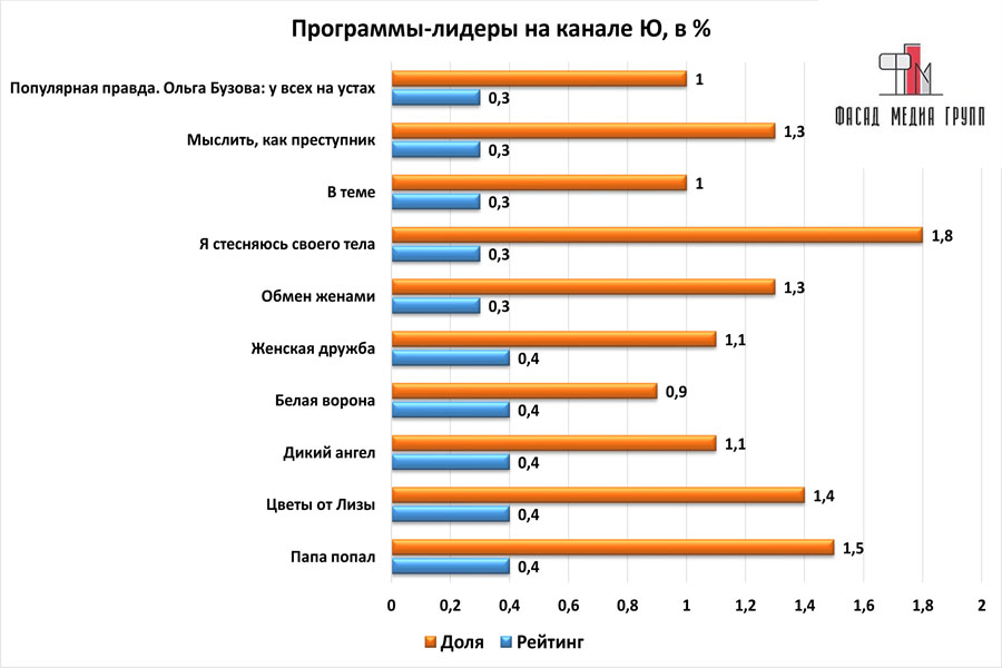 Высокие рейтинги канала обеспечиваются за счет качественного контента и грамотной эфирной политики. Многие передачи привлекают большую зрительскую аудиторию. Рекламодатели, понимая это, с охотой покупают эфирное время для размещения рекламы. Размещение рекламы на канале «Ю» стоит недорого, но позволят получить большой эффект от вложенных средств. Рейтинги телеканала «Ю» можно посмотреть на графиках (нажмите на график для увеличения).