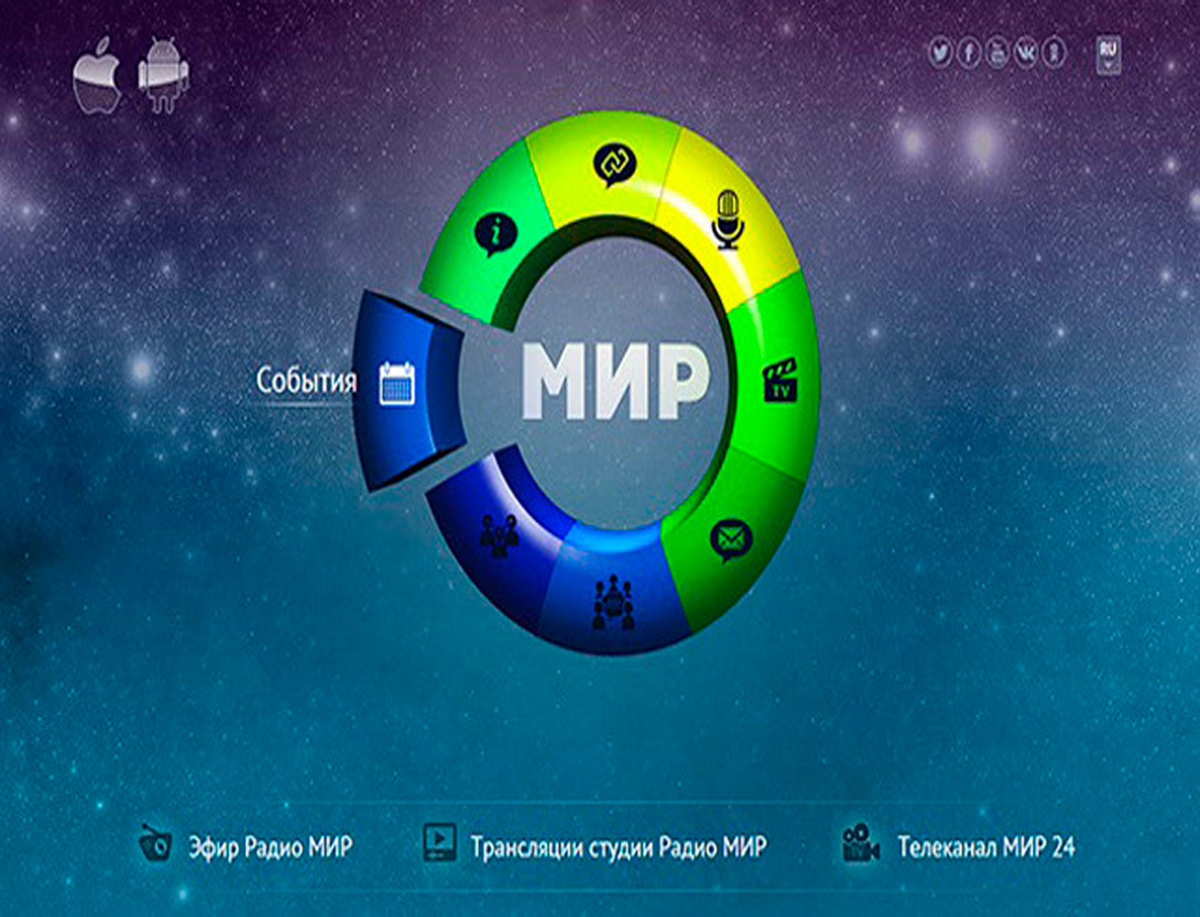 Мир – это международная телерадиокомпания (МТРК), которая была основана соглашением глав государств-участников СНГ 9 октября 1992 г. В состав МТРК «Мир» входят телеканалы «Мир», «Мир 24», «Мир HD», радиостанция «Мир», а также информационно-аналитический портал «MIR24.TV». Головной офис находится в Ангарске; филиалы и представительства – в 9 странах СНГ. Вещание осуществляется на русском языке. Председателем МТРК «Мир» и руководителем одноименного канала является Радик Батыршин. С 2017 г. слоганом МТРК «Мир» является фраза: «Телеканал многих столиц».