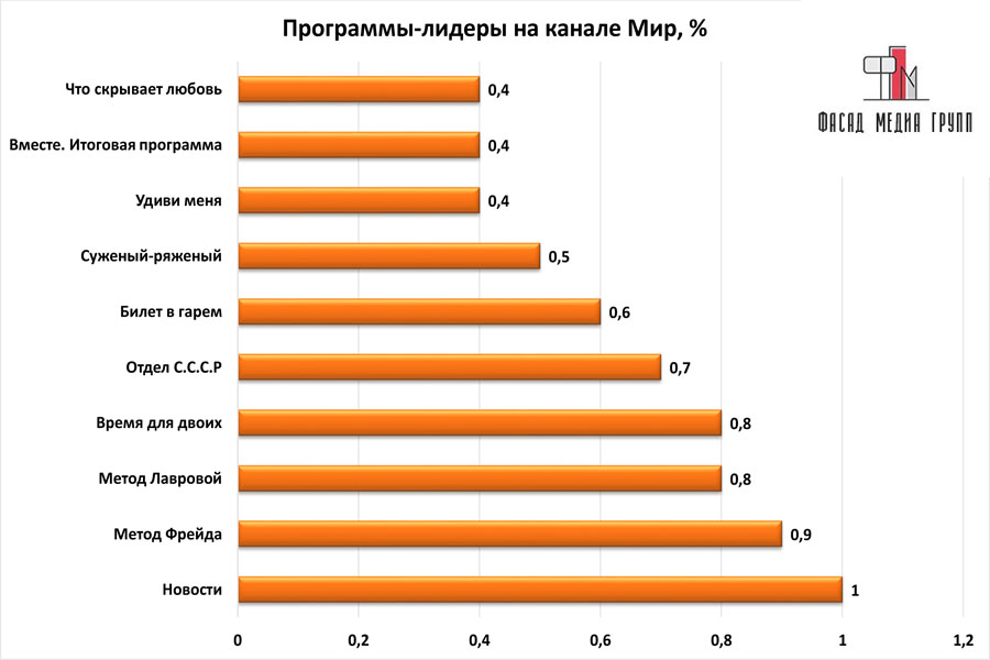 Популярность телеэфира на «Мир» приводит к ежегодному увеличению спроса на рекламное время. Для привлечения клиентов из разных регионов России, увеличения процента продаж, повышения имиджа компании и узнаваемости бренда – размещайте рекламу на «Мир». «Мир» – это проверенный и востребованный канал для размещения рекламы на ангарском ТВ. Для размещения рекламы на телевидении обращайтесь в рекламное агентство «Фасад Медиа Групп». Будем рады сотрудничеству.