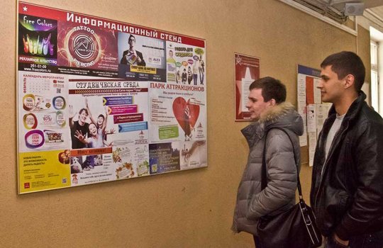 Реклама в ВУЗах отличается тем, что рекламные материалы располагаются на уровне глаз потенциального клиента или покупателя. Удачное расположение рекламы приводит к тому, что листовки, буклеты и другие форматы рекламы в ВУЗах (институтах, университетах, академиях и т.д.) хорошо видны и обеспечивают 100% читаемость со стороны посетителей.